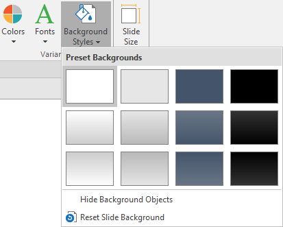 Step 5: Navigate to the Slide Master tab > Close Master View . Then, click Design > Background Styles to see the new Preset Background Styles.
